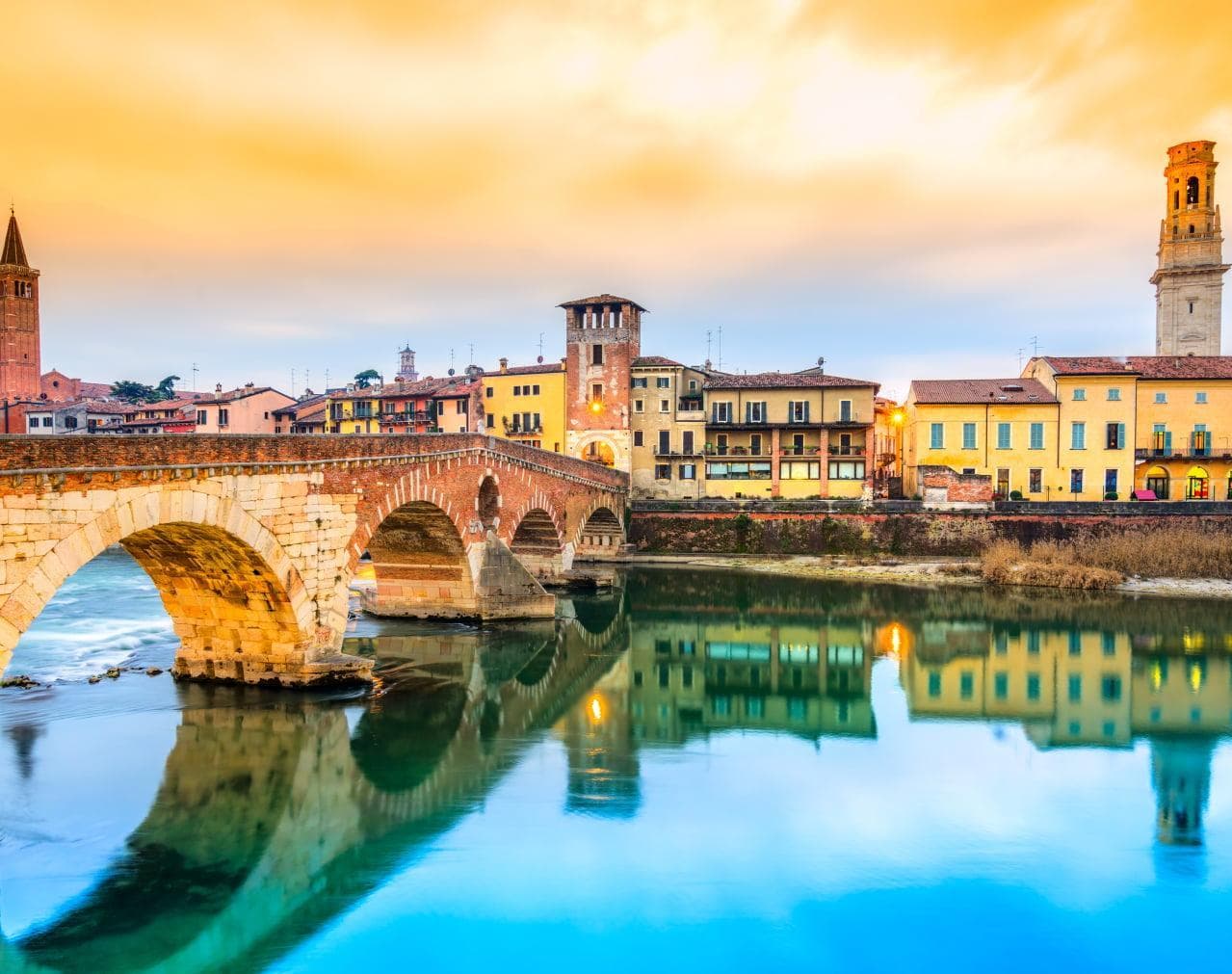 Verona, città fondata dai Romani sulle sponde del fiume Adige, è un autentico gioiello di storia e cultura. L’Arena, uno degli anfiteatri meglio conservati d’Italia, accoglie ancora oggi spettacoli e concerti. Il centro storico, Patrimonio UNESCO, è un intreccio di stradine acciottolate, piazze incantevoli e antichi palazzi. Conosciuta come “città dell’amore” per la tragedia di Romeo e Giulietta di Shakespeare, ospita la Casa di Giulietta con il famoso balcone. Piazza delle Erbe, vivace e storica, e il Teatro Romano, con eventi stagionali all'aperto, completano lo scenario di una città dal grande fascino, che vanta una ricca tradizione enogastronomica.